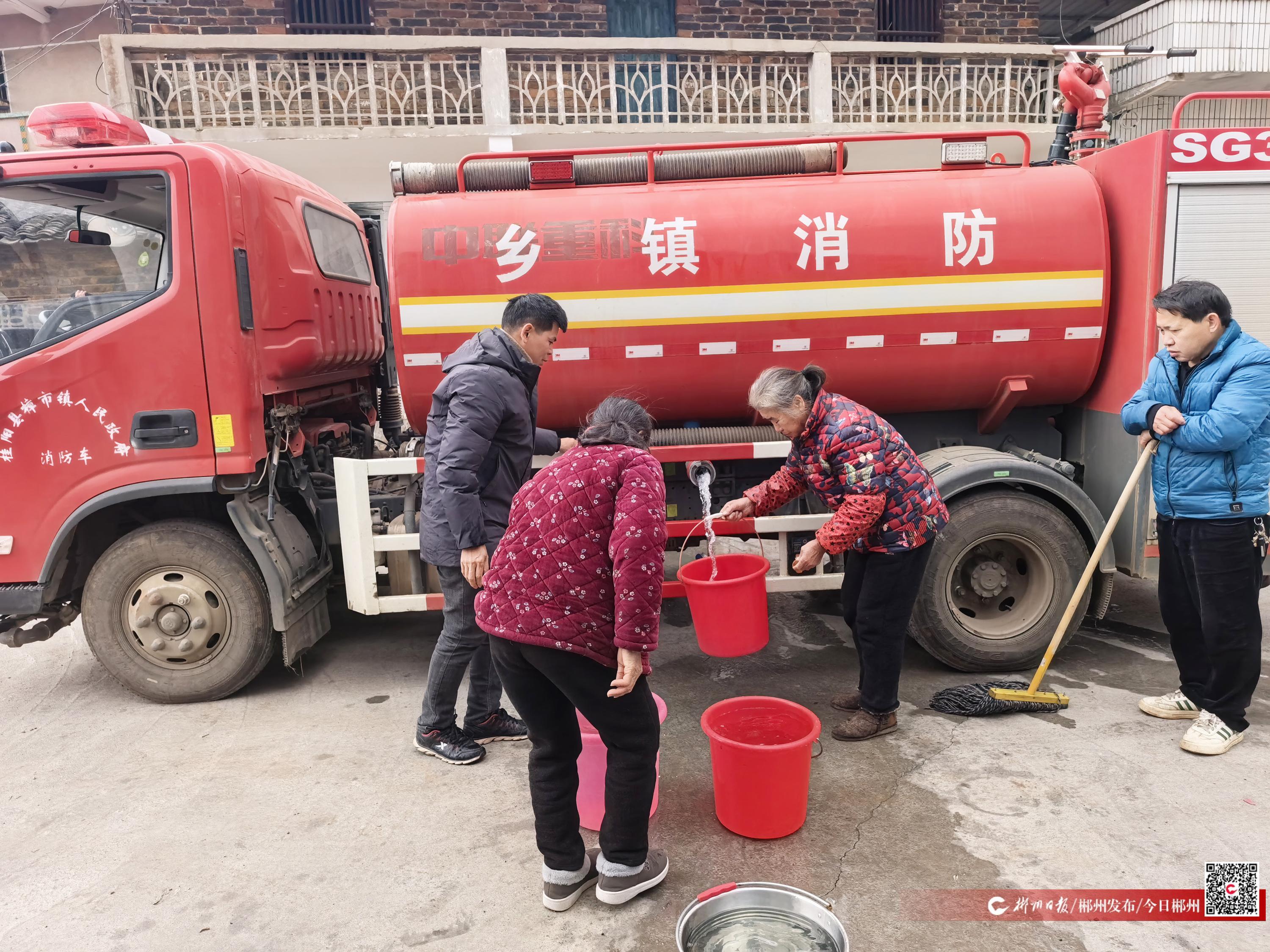 1月23日,桂陽縣樟市鎮(zhèn)梅塘村,一輛滿載清水的消防車在覆冰的村道上緩慢前行,將生活用水精準送到村民家門口,及時解決了群眾的用水難題。
