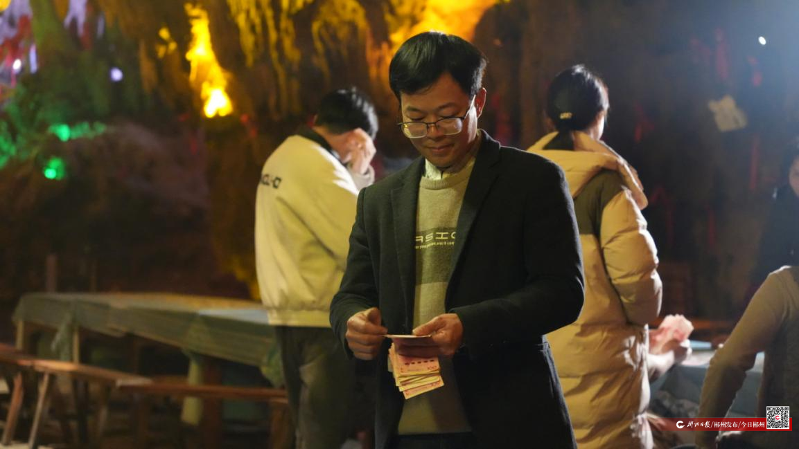 1月31日,色彩斑斕的莽山燕子巖溶洞里,宜章縣天子山村村民相約在這里集聚,一沓沓現(xiàn)金整齊碼放在桌面,村民們有序對賬、簽字、領取分紅金,拿到手后再細細數(shù)數(shù),現(xiàn)場喜氣洋洋、暖意十足,這是村里一年一度的鄉(xiāng)村旅游分紅大會。