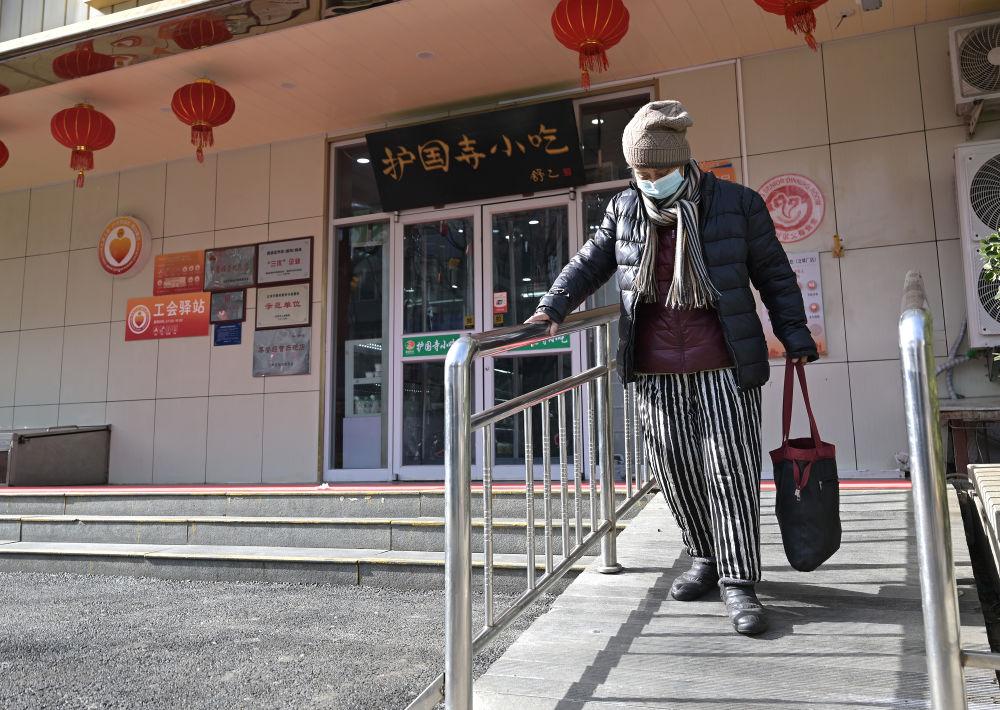 2月10日,一名快遞員走進新街口街道父母食堂。