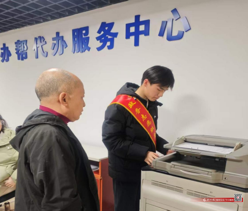 服務(wù)現(xiàn)場,身著統(tǒng)一標識的大學(xué)生志愿者活躍在各崗位,他們主動提供咨詢引導(dǎo)、自助辦理、幫辦代辦、秩序維護等服務(wù),耐心解答群眾疑問,協(xié)助填寫表單、操作設(shè)備。針對老年人等特殊群體提供“一對一”陪辦,用熱情與細心溫暖民心。