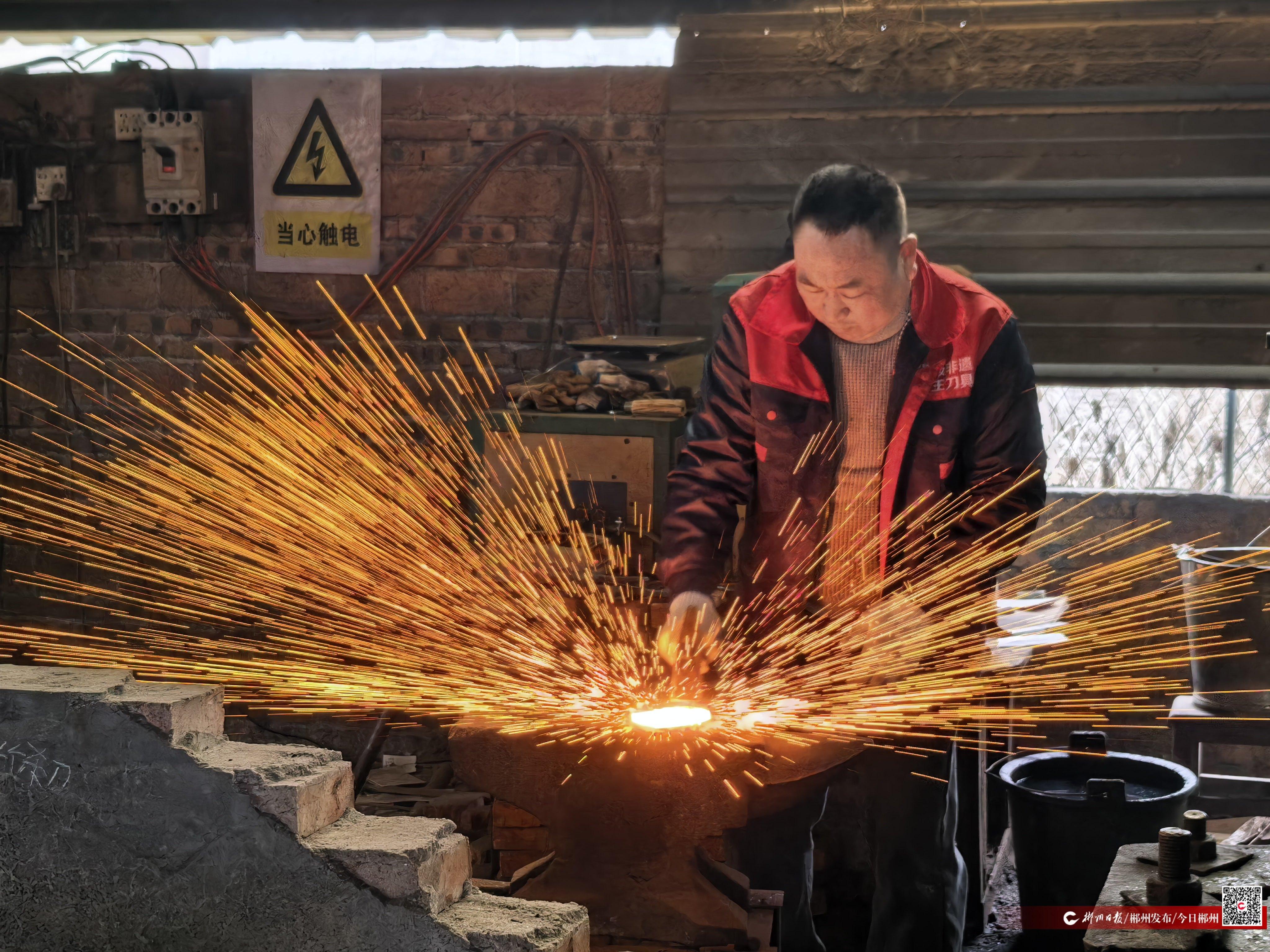 2月10日,嘉禾縣塘村鎮(zhèn)曲龍村的屋檐下掛起臘肉,灶臺(tái)上飄出糍粑香??纱蹇诘腻懺燔囬g里,叮當(dāng)聲依然此起彼伏——57歲的黃吉生正夾起一塊燒得金黃的鐵坯,掄起錘子穩(wěn)穩(wěn)落下?!岸?!叮!”鐵花四濺,如煙火炸開。這位省級(jí)非遺“嘉禾菜刀鍛造技藝”傳承人,額頭上沁著細(xì)汗,笑著說:“江蘇客商催得緊,4000把刀還差200把。年前再干兩天,不能讓人家等?!彼纳砗螅瑤鬃鶢t膛燒得正旺,鐵錘起落,敲出了熱騰騰的響動(dòng)。