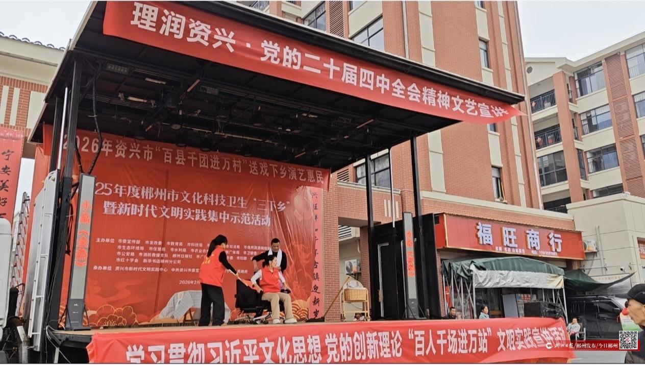2月7日,資興興寧鎮(zhèn)福興苑集中安置點,“三下鄉(xiāng)”活動的舞臺剛搭好,臺下就圍滿了搬遷來的鄉(xiāng)親。人群中,一個穿黑色羽絨服的年輕人拿著話筒走上臺,手掌上還貼著創(chuàng)可貼。