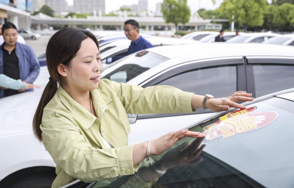 2023年高考期間,江蘇省淮安市開展“愛心送考”志愿者服務(wù)活動(dòng),組織愛心司機(jī)在高考期間為考生提供送考服務(wù)。這是淮安市一名網(wǎng)約車司機(jī)在車輛上張貼“愛心送考”標(biāo)識(shí)。