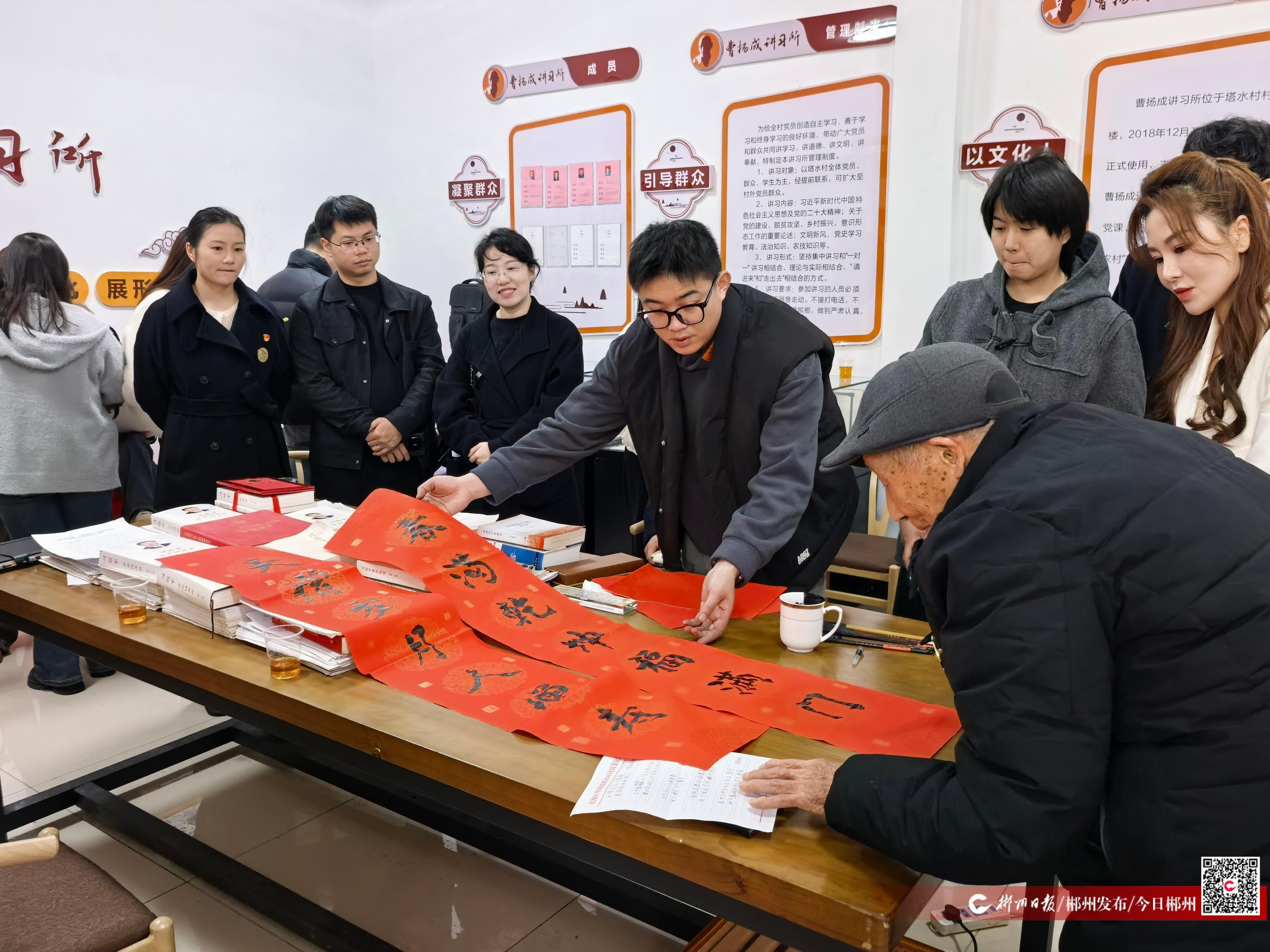 春節(jié)前夕,北湖區(qū)塔水村的“曹揚成講習(xí)所”里擠滿了年輕人。書桌上堆著鎮(zhèn)紙、筆記本、滅火毯、手電筒,還有兩袋新碾的大米。