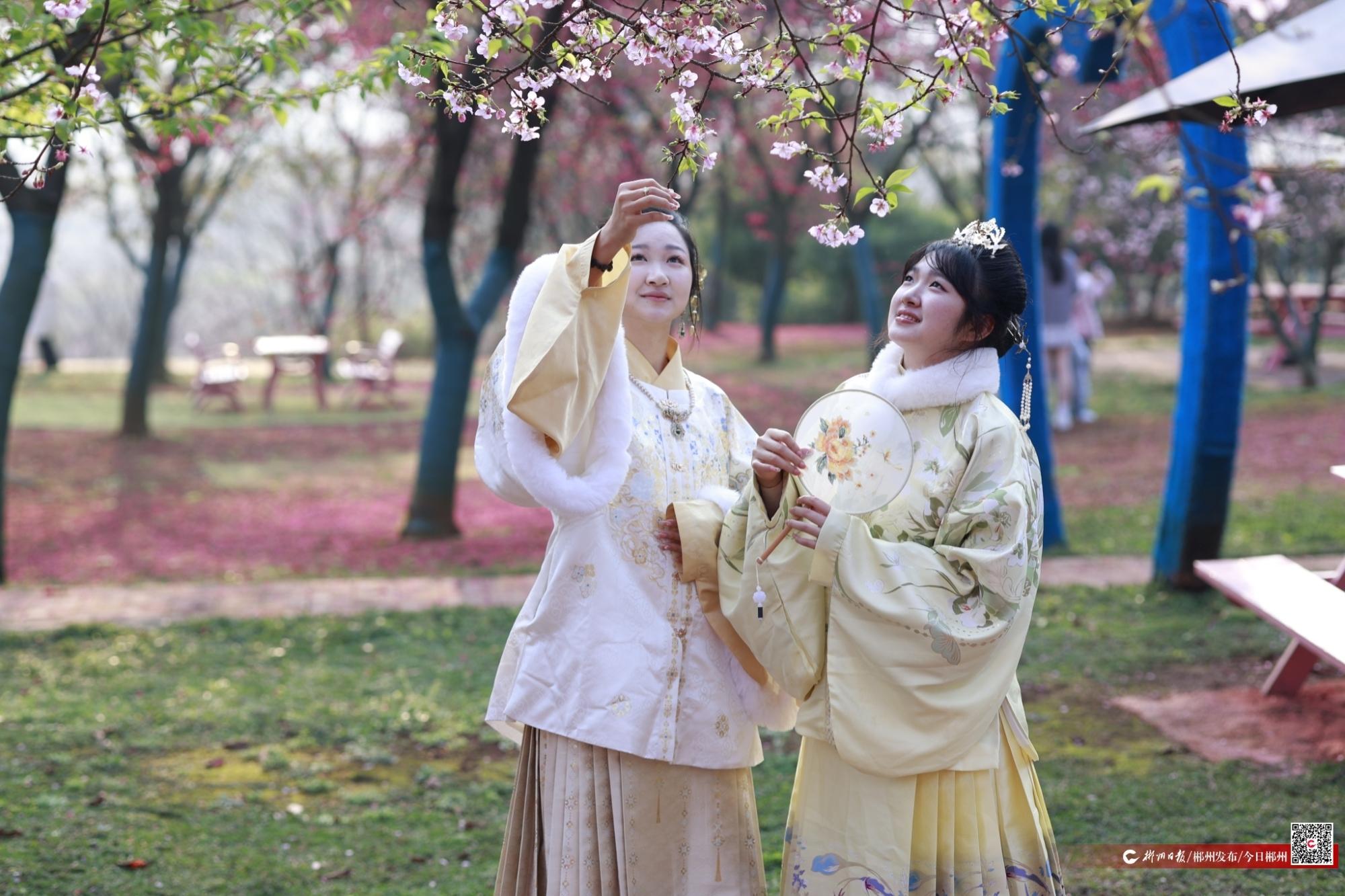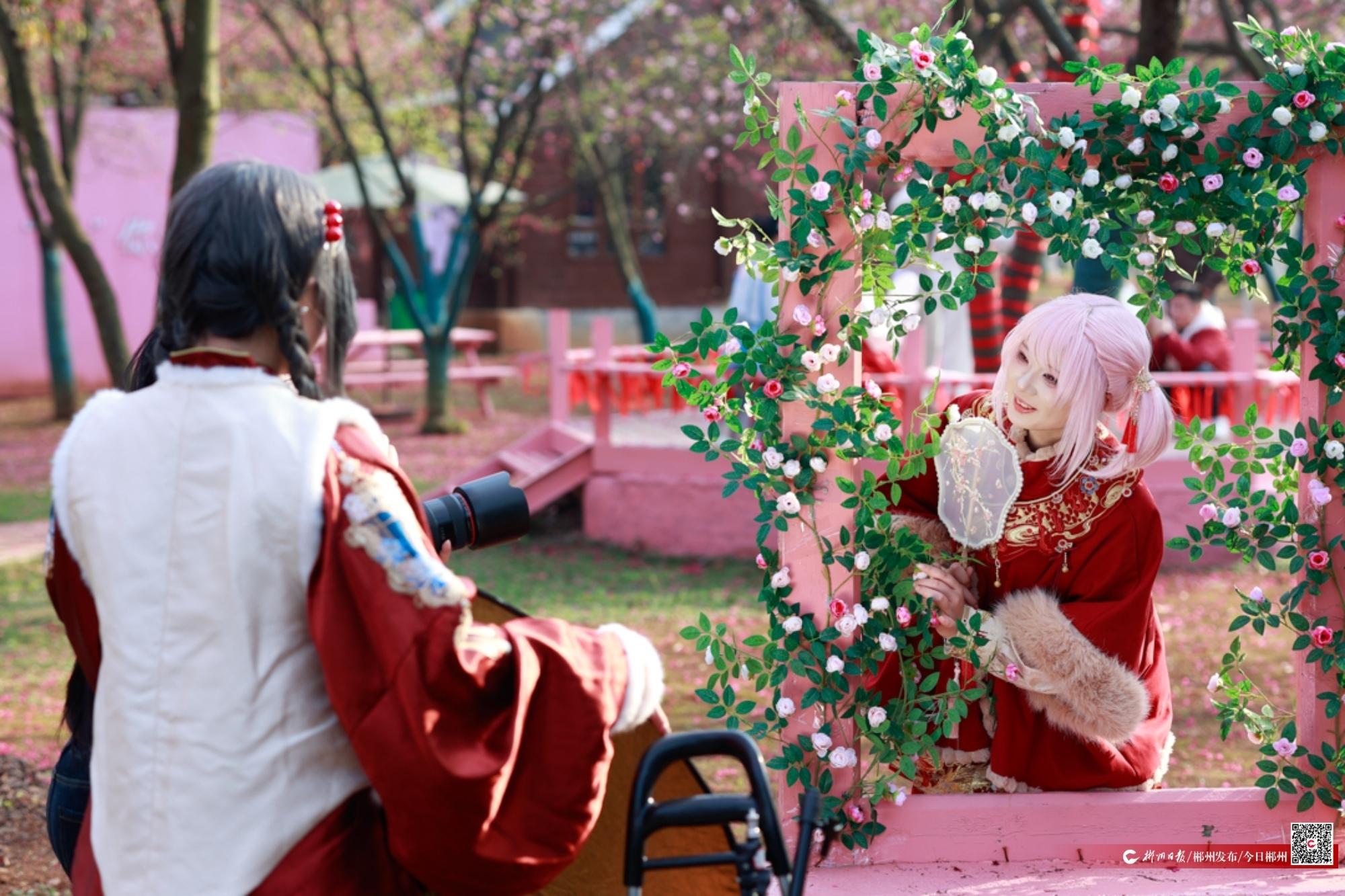 部分游客身著古裝漢裙、精美服飾,徜徉花間,不時有身邊的游伴幫忙留影拍照,記錄著美好時光?!翱吹竭@些粉色、玫紅色的櫻花讓人賞心悅目,漢服和櫻花背景很適配,拍照也很出片?!庇慰驮鴷澄男χf道。